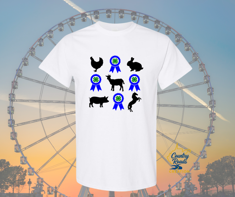 Show off your 4-H pride with this bold and fun livestock-inspired tee! Featuring classic silhouettes of fair animals — chicken, rabbit, goat, pig, and more — paired with vibrant blue ribbons and the iconic 4-H clover, this shirt is perfect for every showman, volunteer, and supporter of youth agriculture.