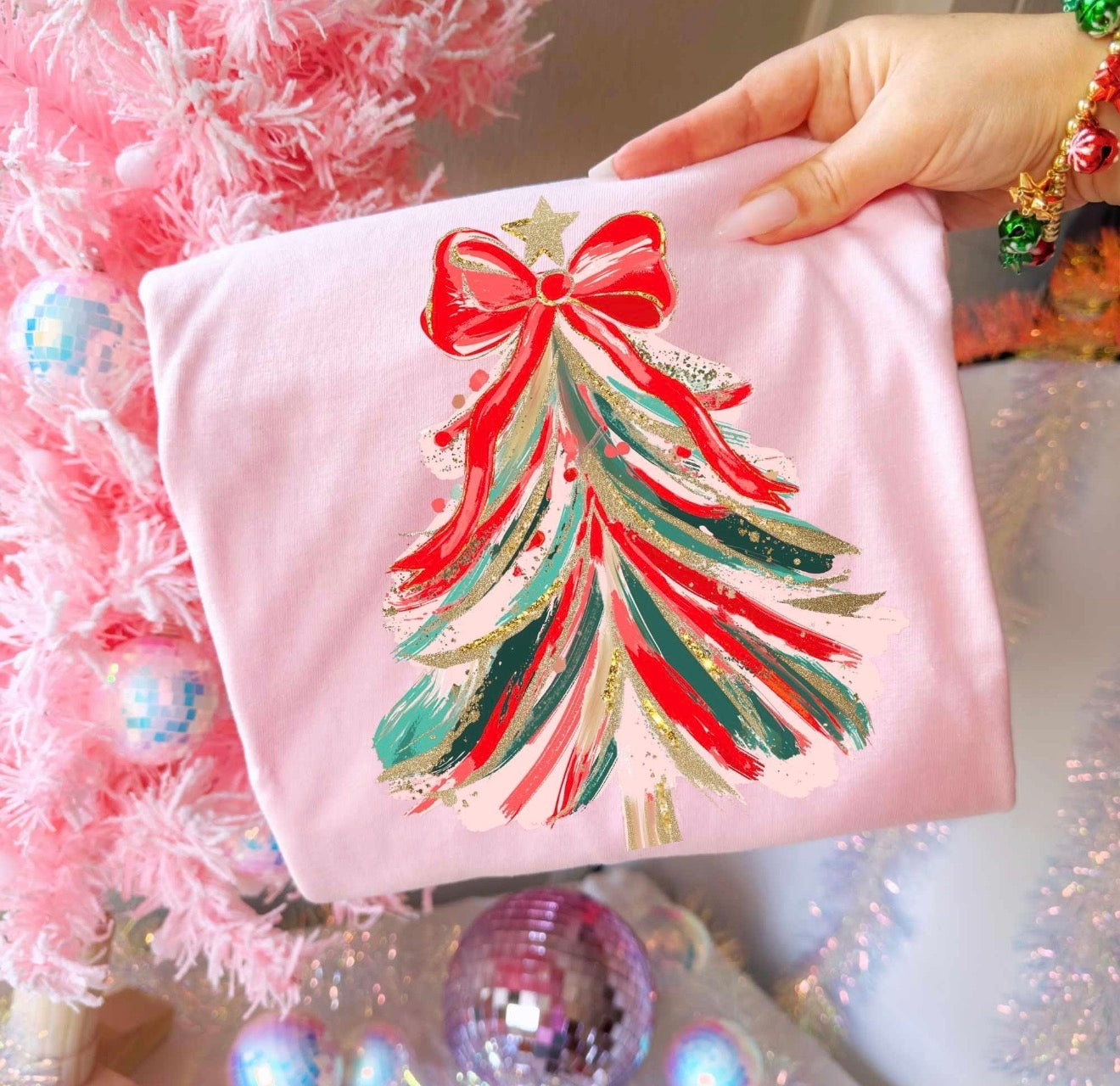This festive design features a hand-painted style Christmas tree in classic red, green, and gold brushstrokes, topped with a big red bow and a golden star. The soft pink background gives it a sweet, cheerful twist β perfect for anyone who loves holiday sparkle with a touch of glam.